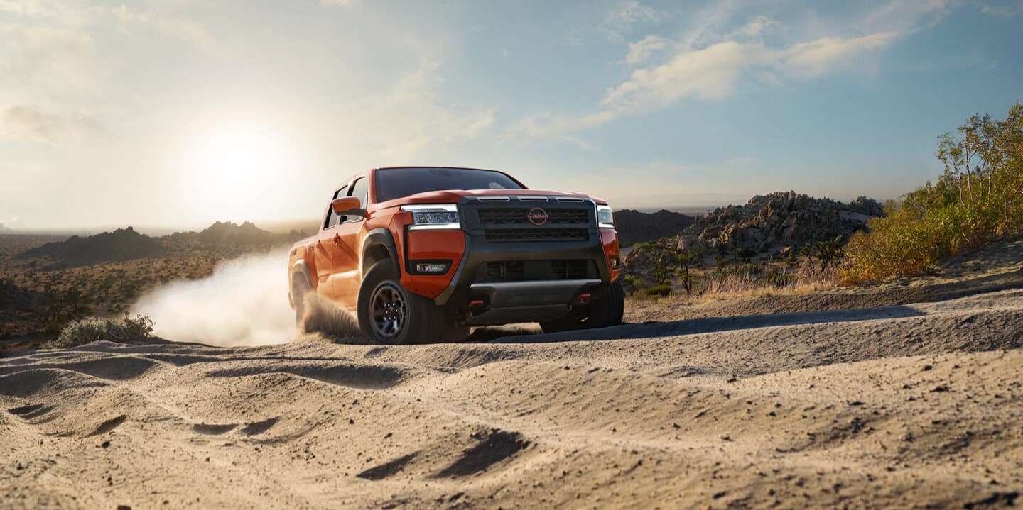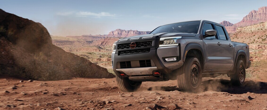 The Frontier's striking exterior design draws attention with its confident stance and athletic proportions. It is available in both King Cab and Crew Cab versions, offering versatility to suit your needs. The front showcases Nissan's signature grille, accompanied by LED headlights with automatic high-beam functionality. Customers in High Point can select different bed lengths to maximize cargo space. The 17-inch alloy wheels combine style and performance, while the PRO-4X and PRO-X trims feature unique design details that highlight their improved capabilities.